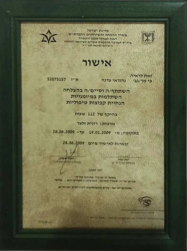 תעודת השתלמות מיומנויות והנחיית קבוצות טיפוליות של עדנה נהוראי משנת 2009